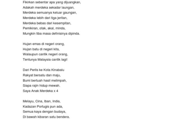 Lirik lagu:saya anak malaysiasaya anak malaysiasaya anak malaysiasaya anak malaysiasembilan belas lima puluh tujuhbulan lapan kita .